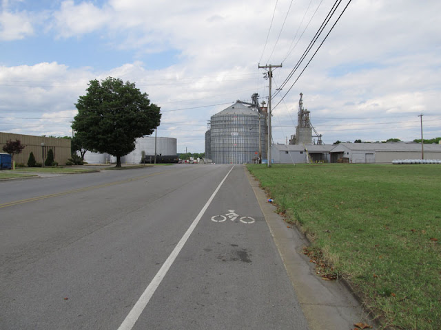It moves further away from the road as it heads west toward Rhodes Ferry Park.Finally, it turns away from the main road and winds all by itself between two huge industrial complexes.